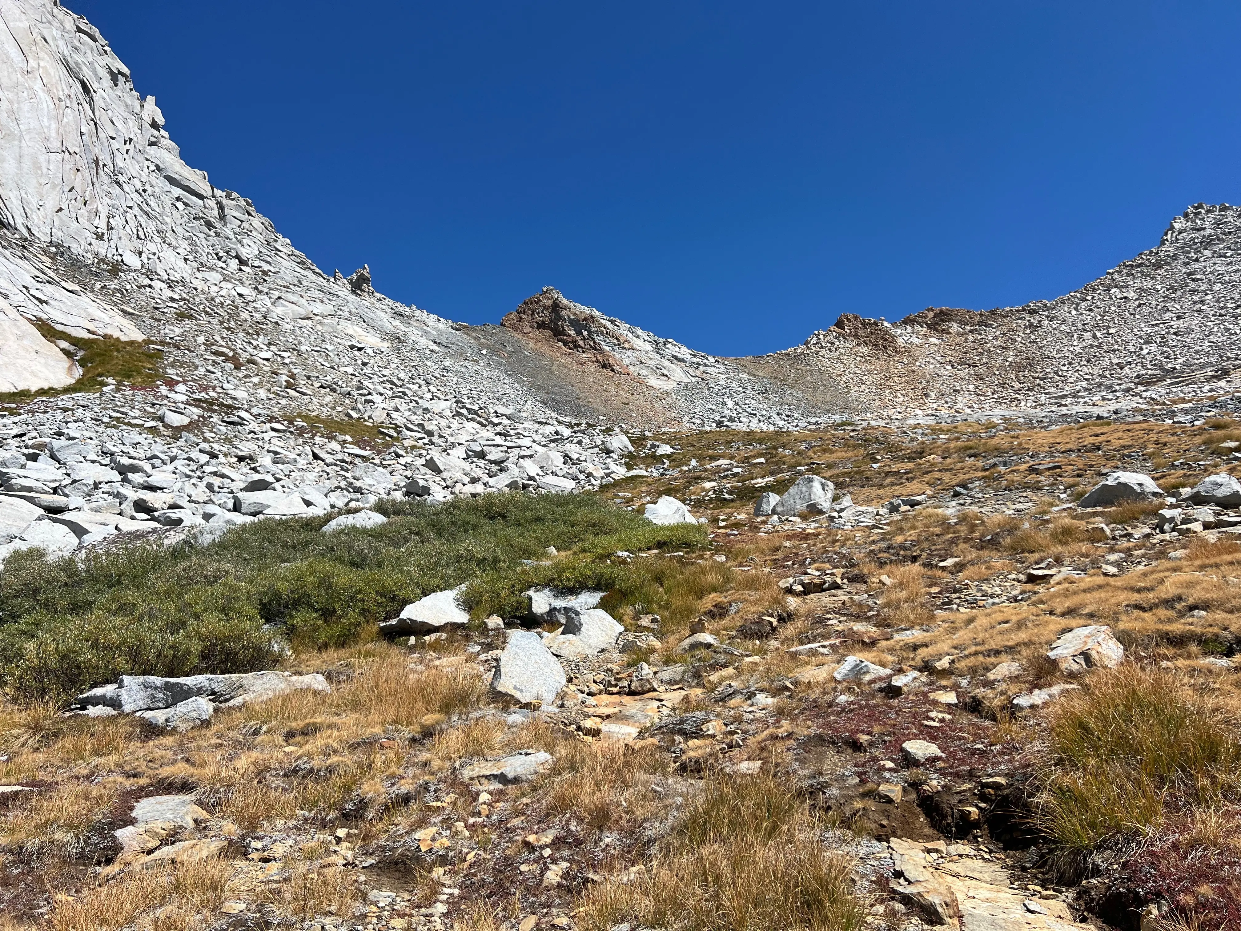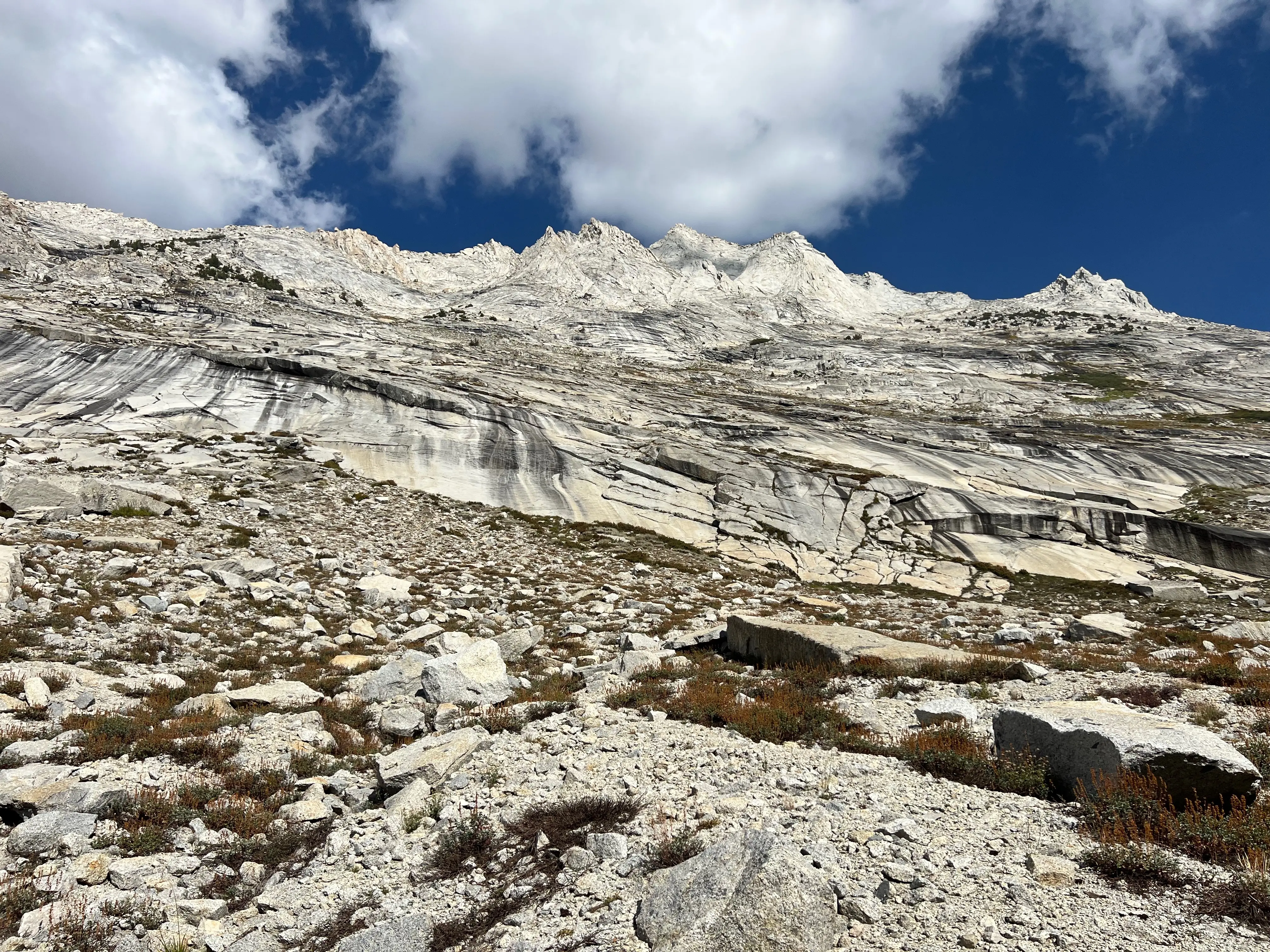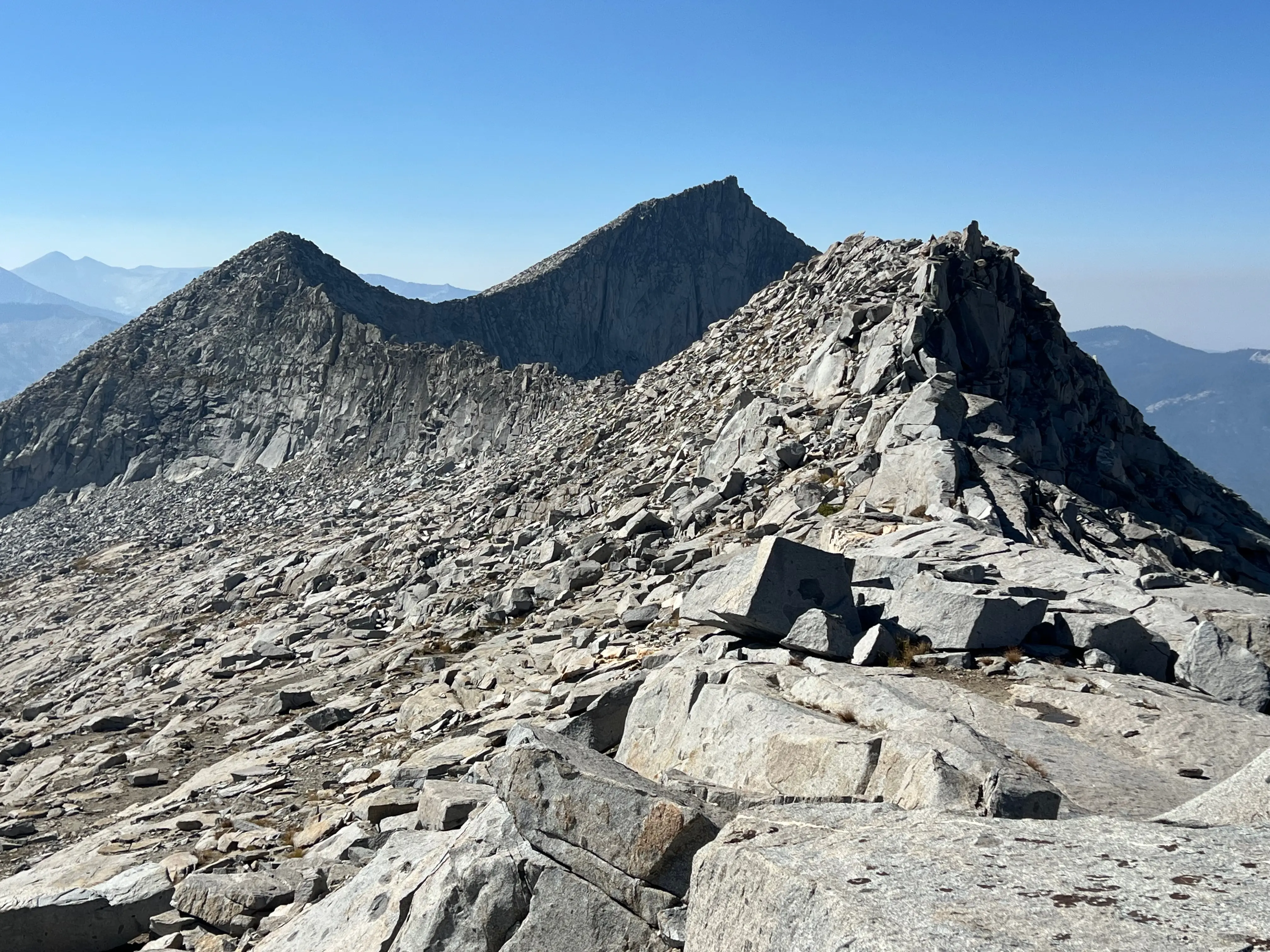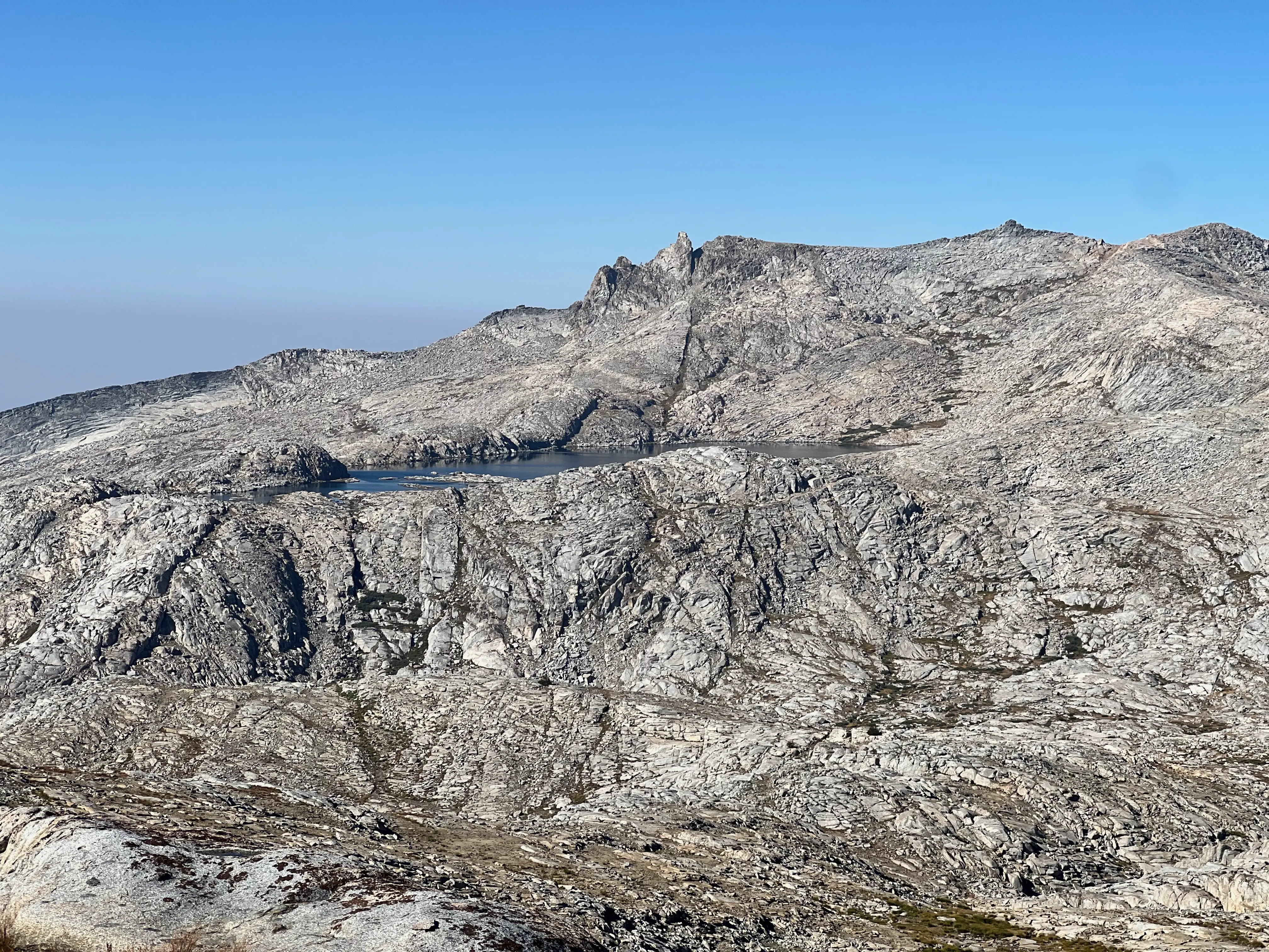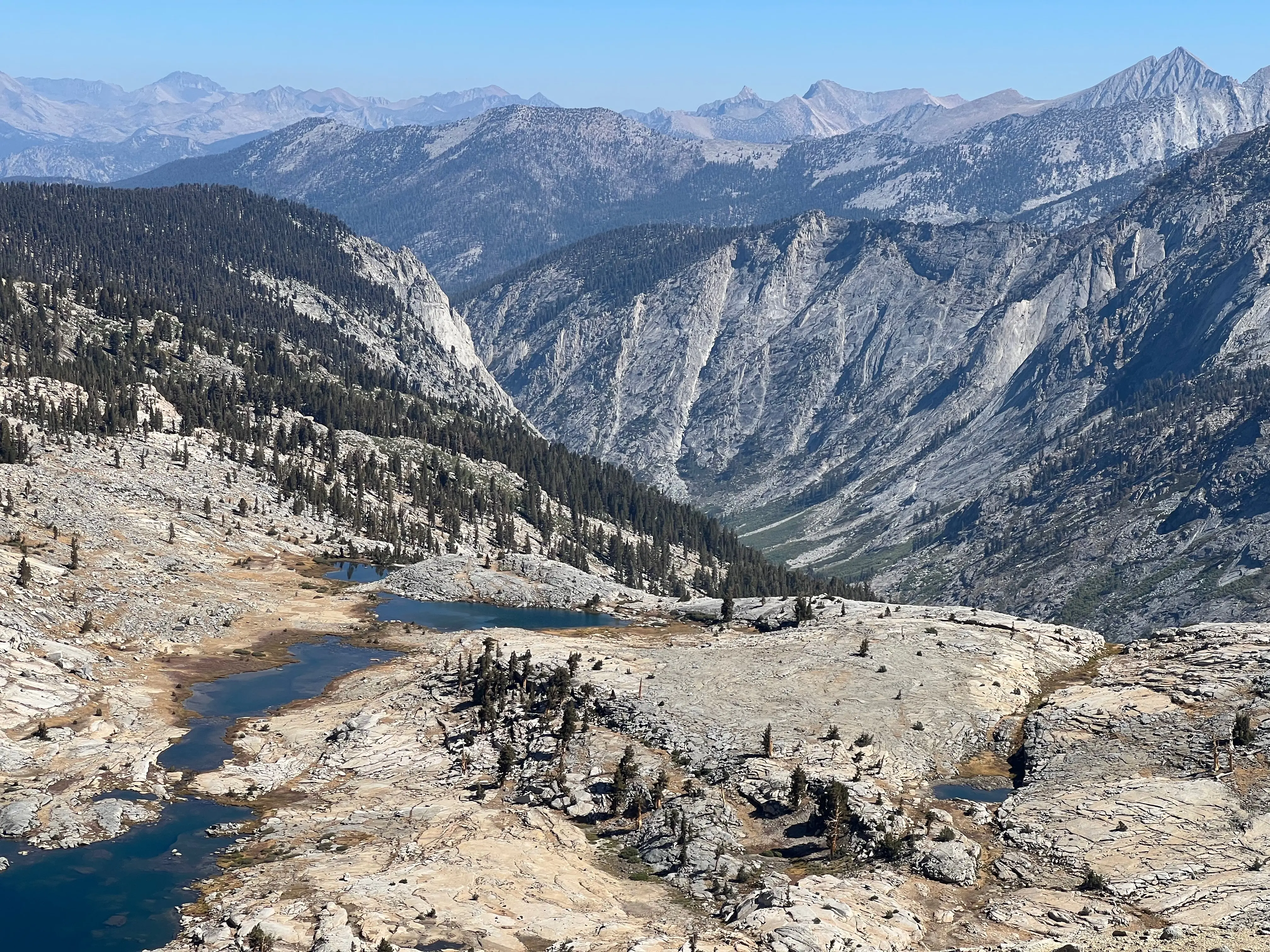 I was a little worried about Pterodactyl Pass since I hadn't read too much detail about the route. Once I was on it though it was pretty obvious. I stayed high and got to the saddle around 10:30, easy peasy. The views of the surrounding area were breathtaking! Looking down Buck Creek and seeing Timber Gap in the distance was absolutely beautiful. Mt Stewart and the Lilliput Glacier were stunning. The Kaweahs were standing strong and prominent in the background, commanding attention. The relief created by the different layers of rock and mountain made it feel like I was higher than the 11,000ft of the pass! From here I could see two options, Horn Col or down and up the Big SEKI Loop over Elizabeth Pass. I hadn't read whether Horn Col was doable and looking at the glaciated slick granite, decided against it. In hindsight I wish I had given it a shot since it now seems doable from what I've read. But traveling solo as I age has made me a little more cautious without proper preparation.