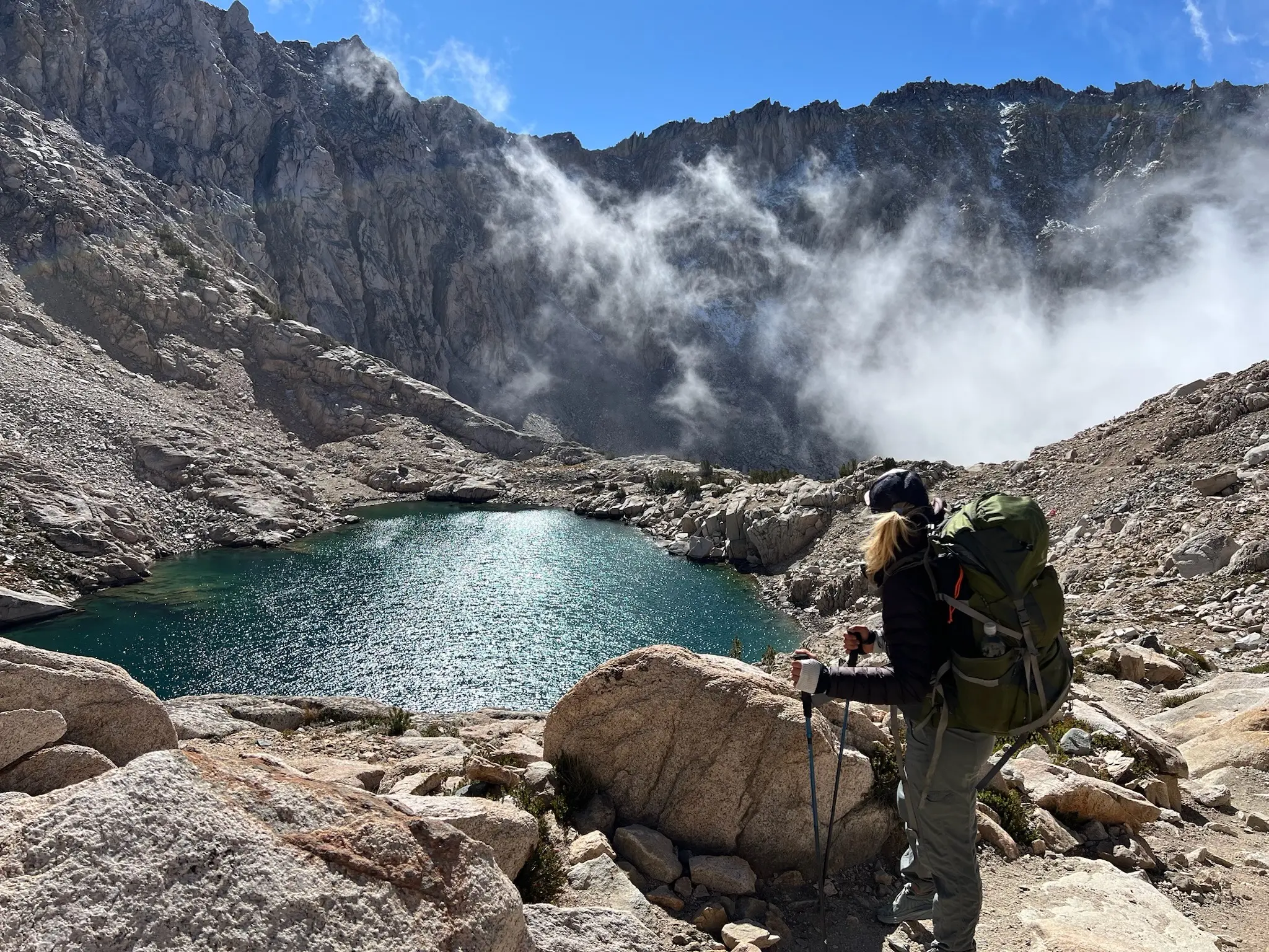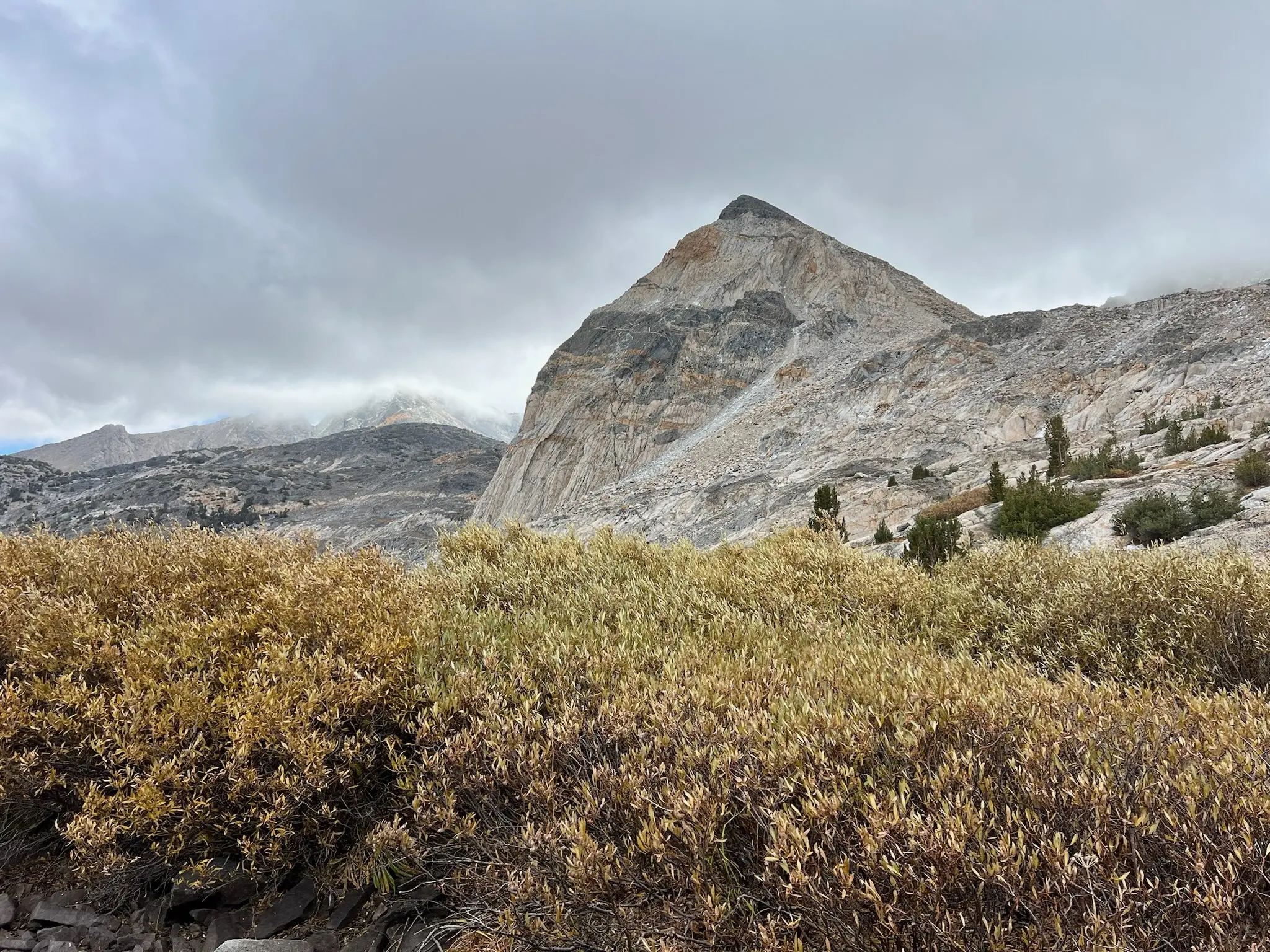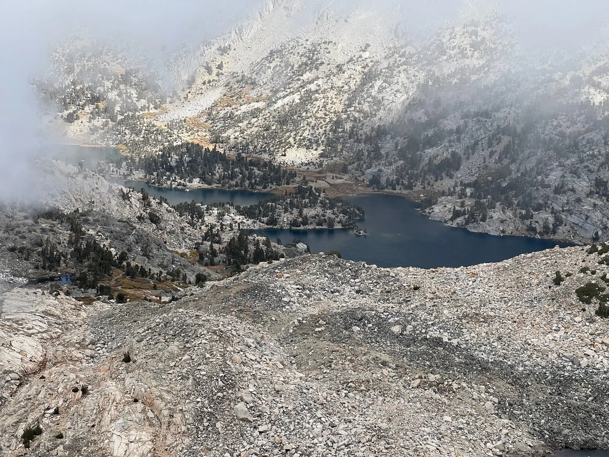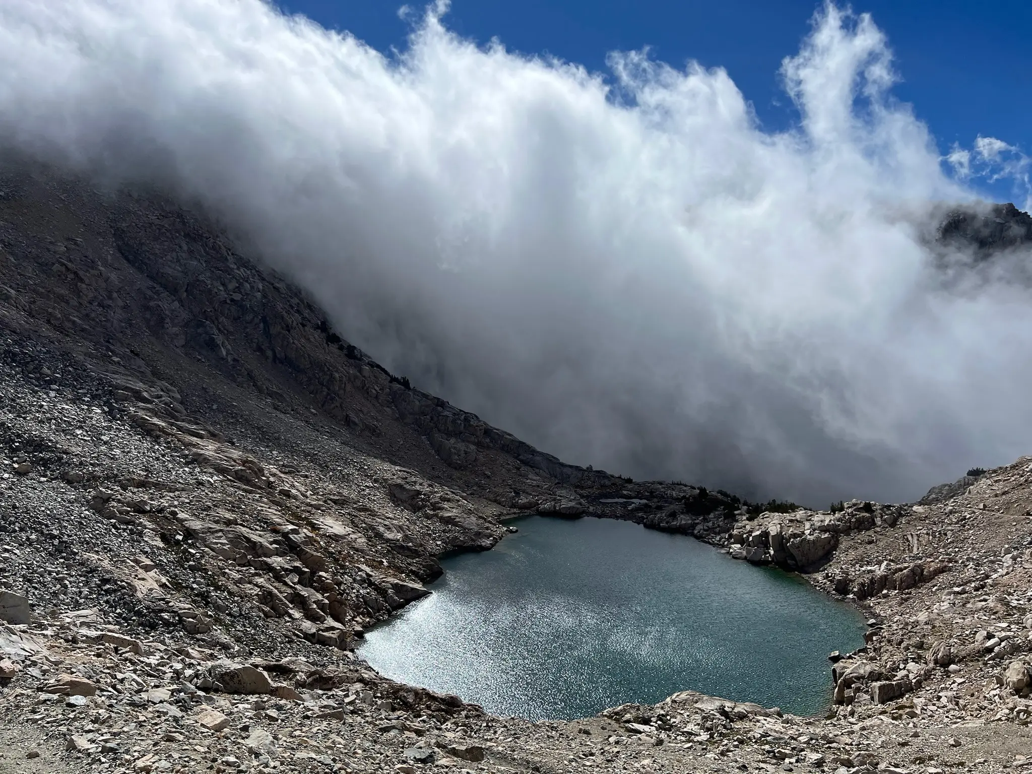 The trail to Glen Pass is pretty moderate, not too much climbing compared to the first day, but still a fair bit over a much shorter period. But as we climbed we saw some clouds creeping up Charlotte Creek, which would ultimately change our decision to go cross-country into Gardiner Basin! It started slowly and didn't cause any concern, merely a natural beauty to behold. It quickly engulfed us entirely! Certainly a unique, amazing experience, but also freezing and windy which zapped our warmth. It also made us realize that we were unprepared for real cold, by the time we reached the apex of Glen Pass, we made the decision to stick to the Rae Lakes loop and save Gardiner Basin for another time.