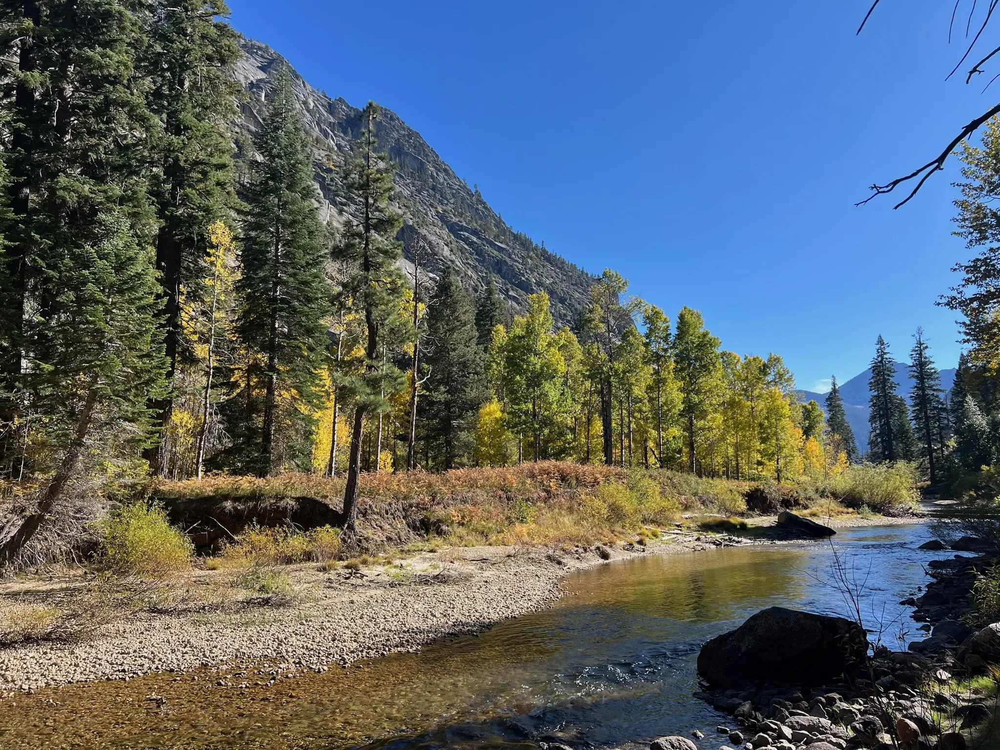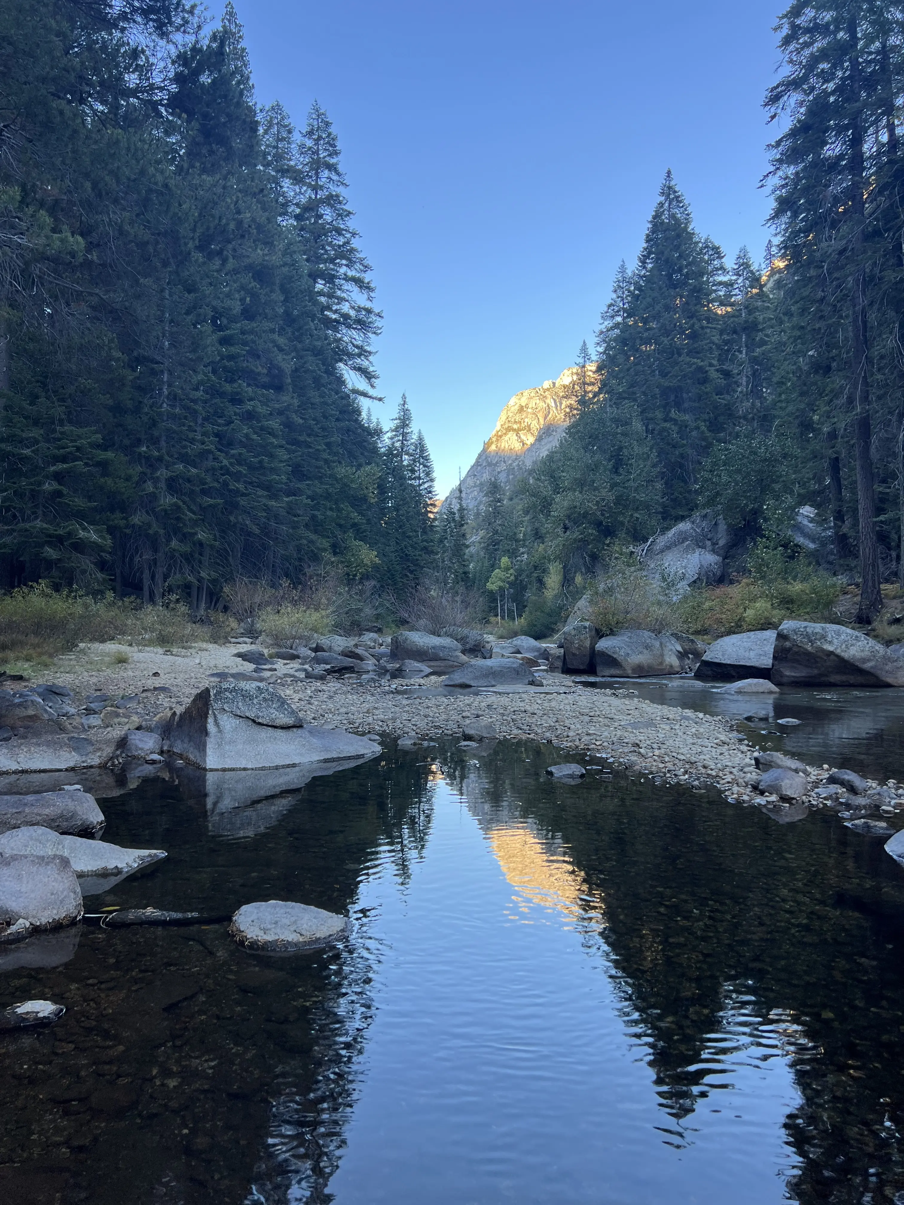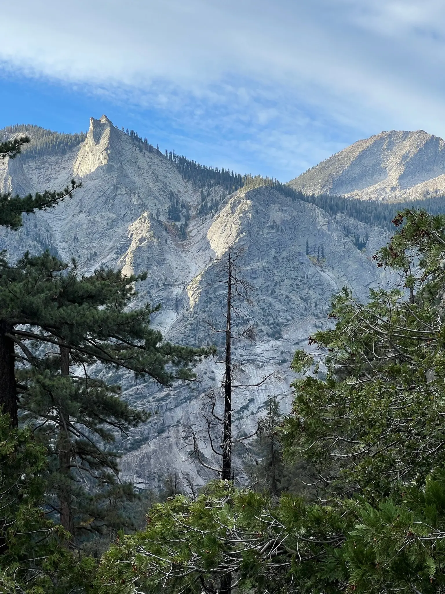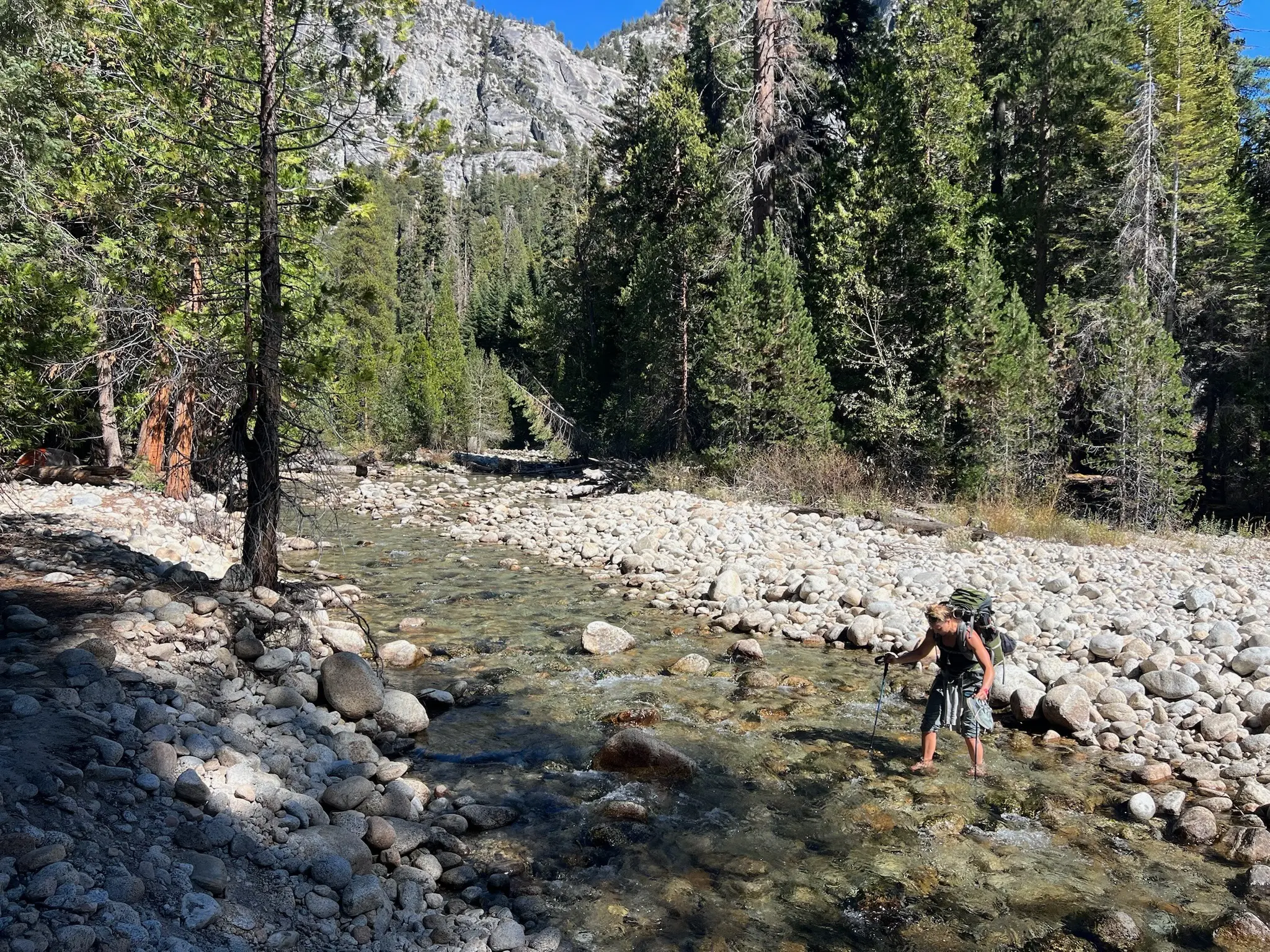 Merely fifteen minutes later we were crossing the mighty South Fork of the Kings River, making our way to Lower Paradise Valley. It really does live up to its name. The route south is a gentle slope, the trail is pleasant and soft, beautiful scenery on either side of us. It really is a paradise to hike in. The old bridge over the Kings River was washed away during the 2016-2017 season from severe flooding so we had to cross the old fashioned way. I jumped over some rocks maybe 100ft south of the junction with Woods Creek and Cara took her shoes off and walked in the shallows. The trail was only a few hundred feet from the shore but it was a little confusing finding the path amongst the huge group of dozens of campsites. Eventually we found it and started hiking south.
