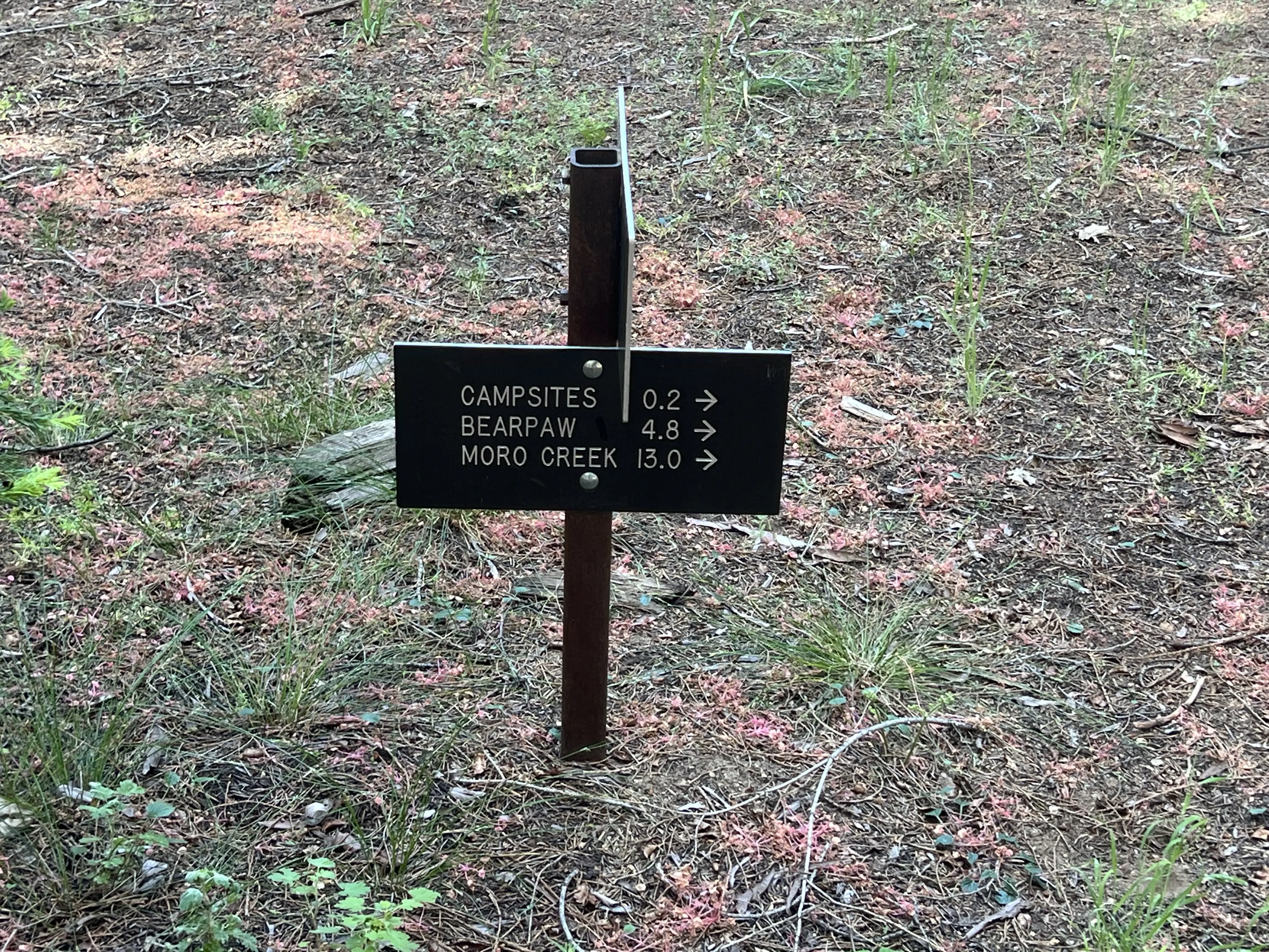 Our new impromptu plan was to hike to Redwood Meadow Grove, then see if we can hike out on day 3. We had a very nice easy day hiking mostly downhill. The section from the trail junction with Timber Gap to Redwood Meadow Grove had quite a lot of downed trees and trail obstructions, but was otherwise uneventful. Just beautiful wild flowers and gigantic redwood trees and tons of oxygen as we descended to our 6,000ft elevation destination.